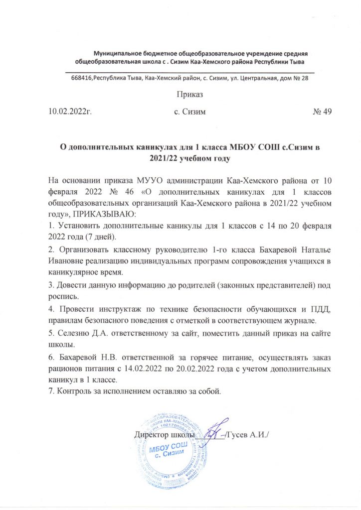 О дополнительных каникулах для 1 класса МБОУ СОШ с.Сизим