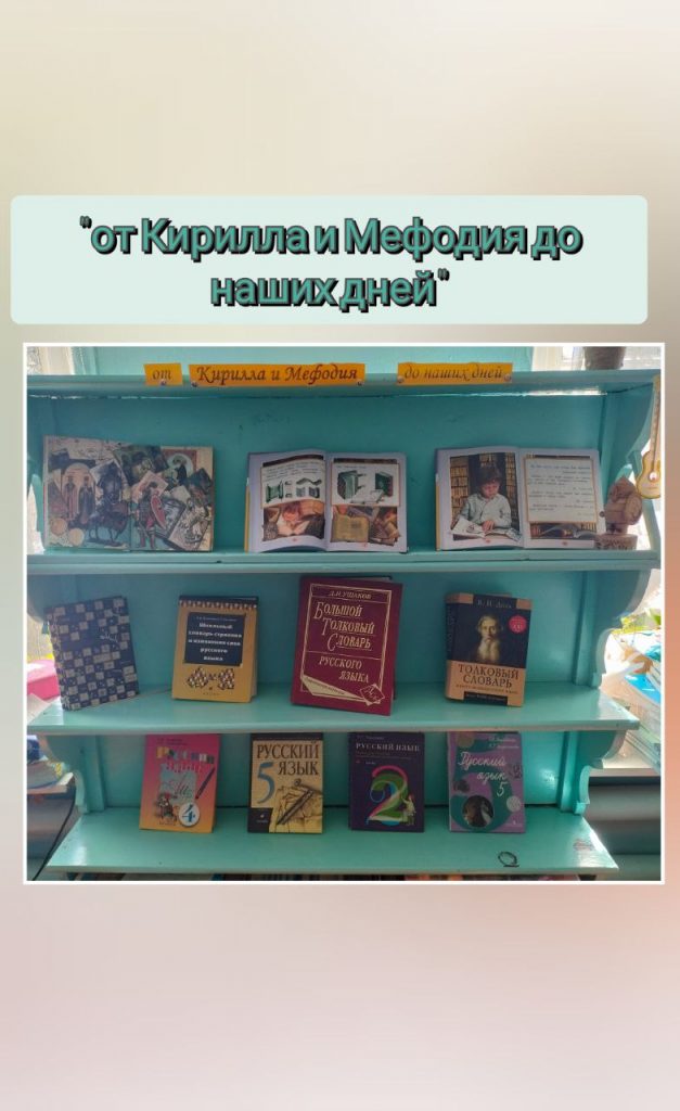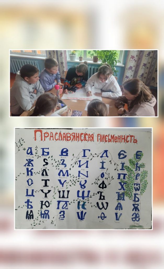 Тематические уроки в 5 и 6 классах, «Тайны нашего письма» и «Сокровища азбуки». Была организована выставка рисунков «Мой любимый литературный герой» (по произведениям А.С.Пушкина), «По сказкам Пушкина», и книжная выставка «от Кирилла и Мефодия до наших дней», учащиеся 7 класса подготовили плакат «Праславянская письменность».