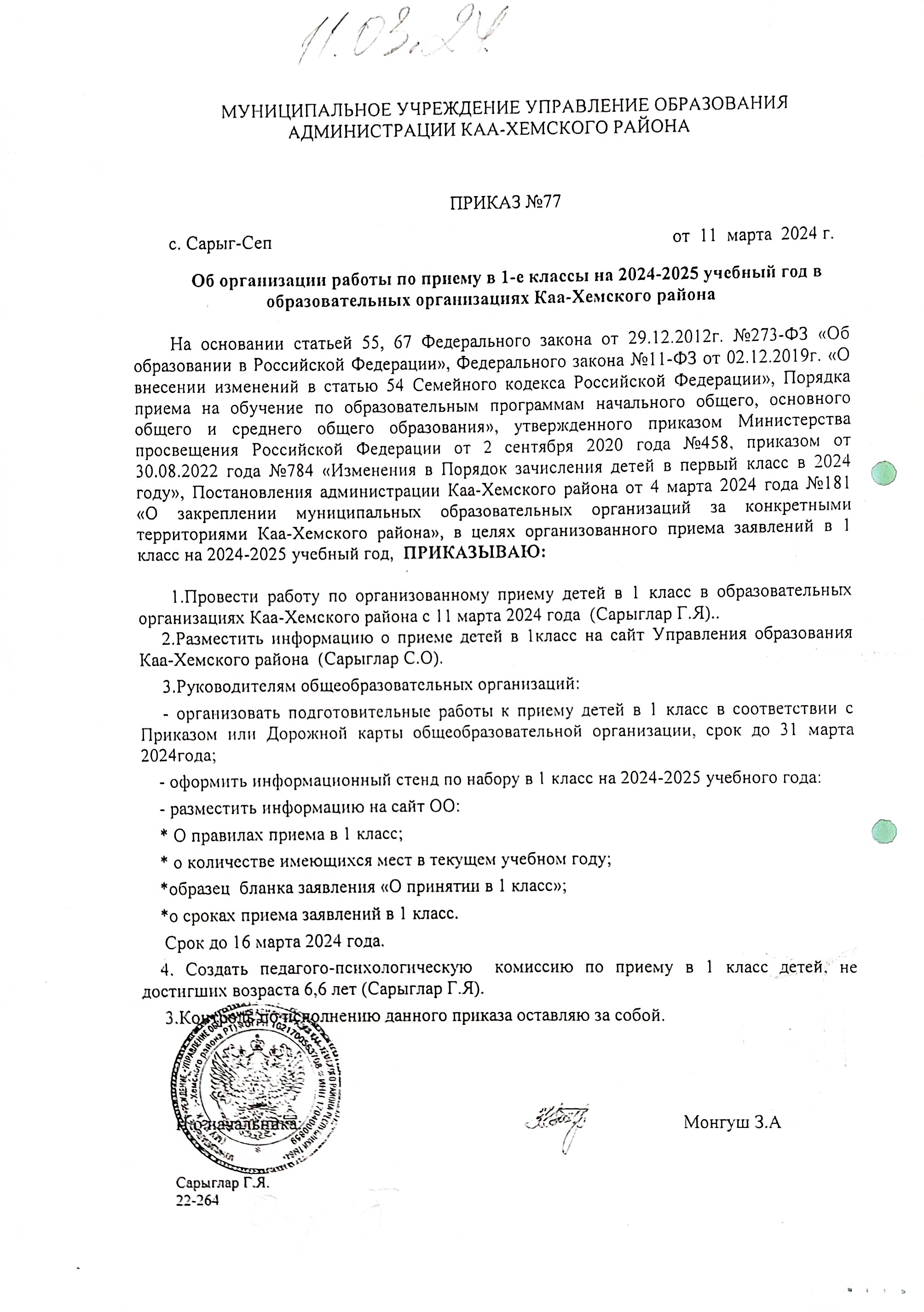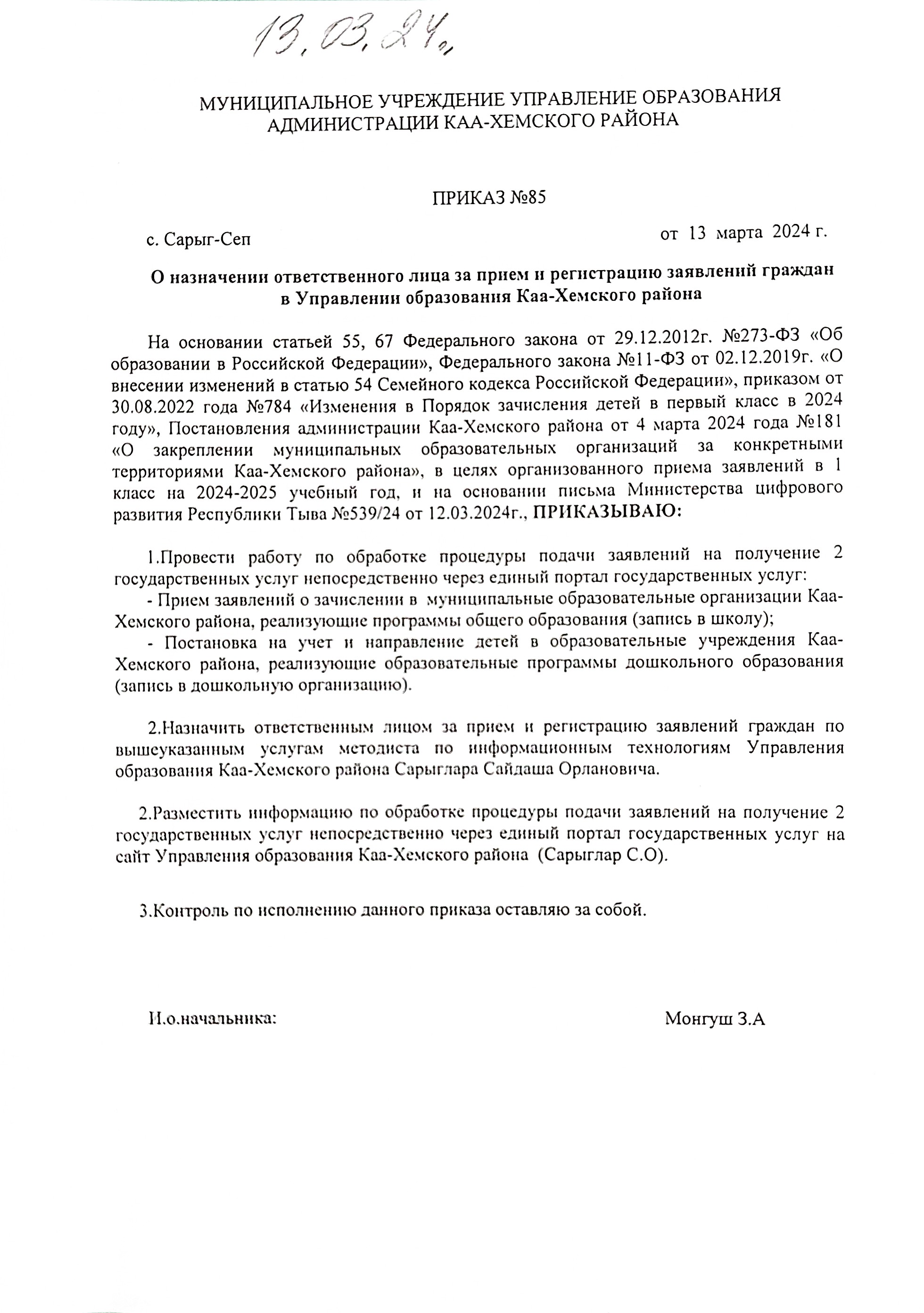 Об организации работы по приему в 1-е классы на 2024-2025 учебный год в образовательных организациях Каа-Хемского р-на.Скачать