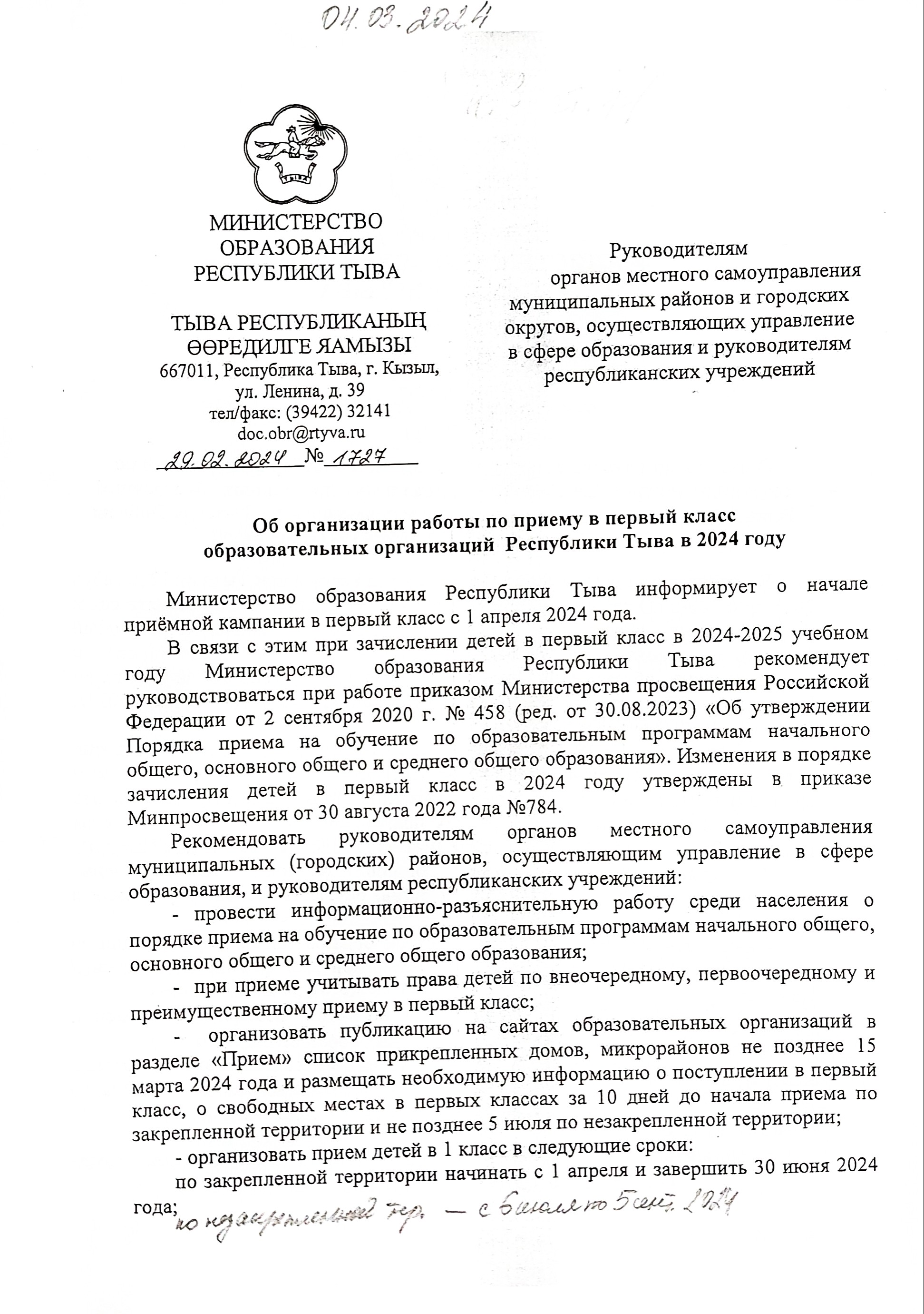 Об организации работы по приему в первый класс образовательных организаций Республики Тыва в 2024 году.Скачать